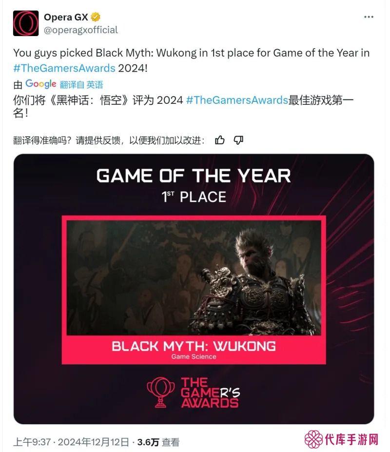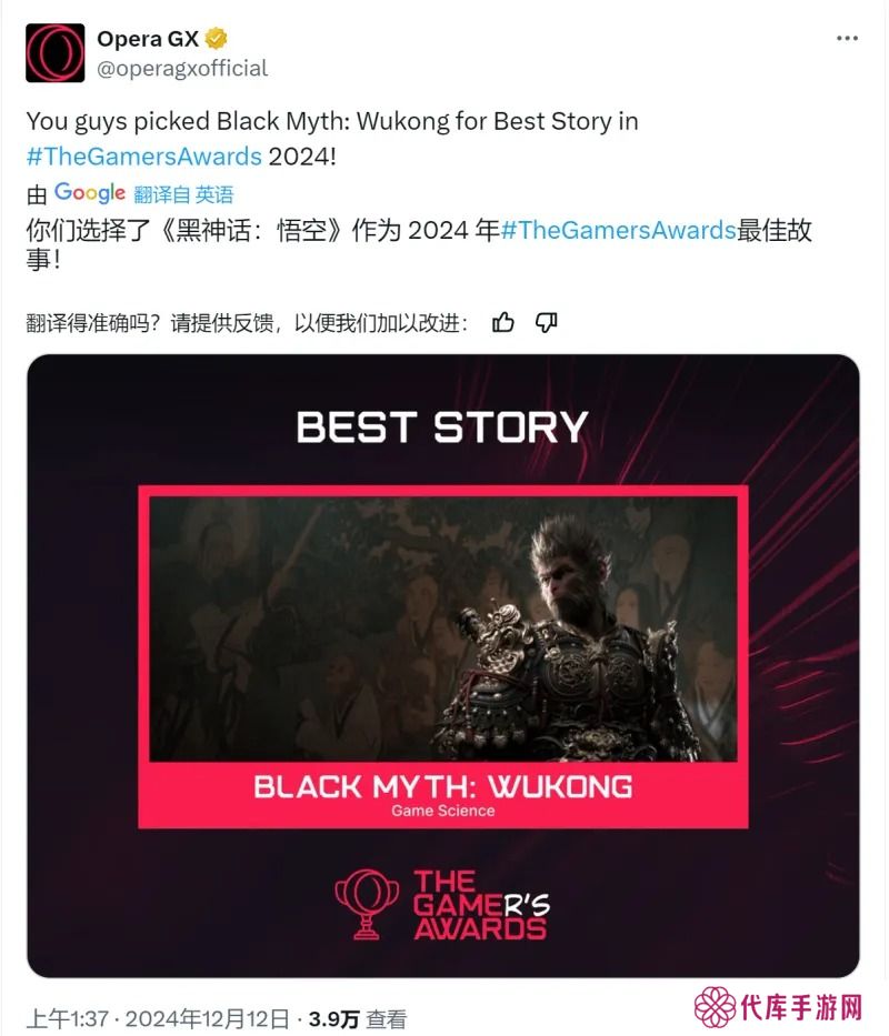 黑神话悟空在Opera GX举办的玩家票选活动中获得了【年度最佳游戏】和【最佳叙事】两项大奖。