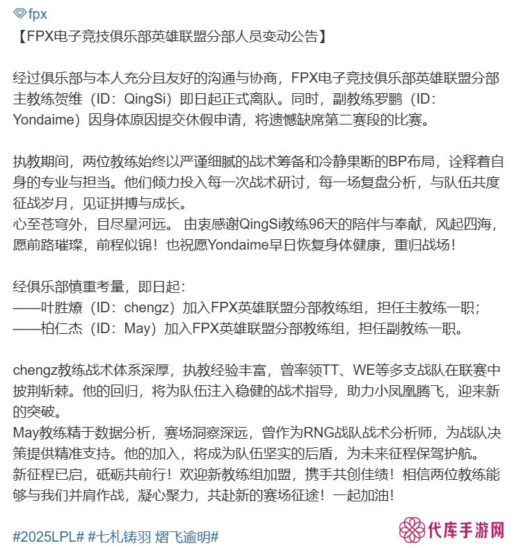 今日,FPX官方发布人员变动公告:主教练贺维(ID:QingSi)即日起正式离队;副教练罗鹏(ID:Yondaime)因身体原因提交休假申请,将遗憾缺席第二赛段的比赛。