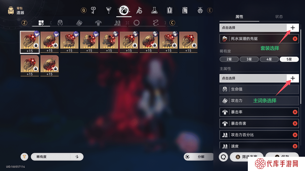 筛选建议以筛选死水套为例:主动选择套装后,对照图鉴选择衣服、脚部的主词条推荐属性;
