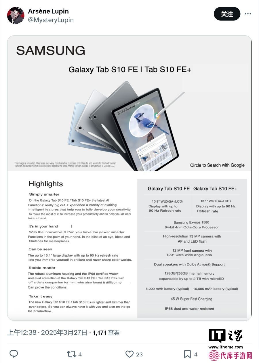本站 3 月 28 日消息,消息源 @MysteryLupin 昨日(3 月 27 日)在 X 平台发布推文,分享了三星 Galaxy Tab S10 FE 和 Galaxy Tab S10 FE+ 两款平板的完整规格、欧洲定价及高清渲染图。