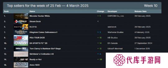 2025年Steam第10周销量榜现已更新。不出所料,三天卖了800万份的《怪物猎人:荒野》,蝉联了榜首位置。本期榜单,新发布游戏并不算太多,但也存在异军突起的黑马作品。具体排名如下——