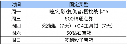 和往期签到活动一样,3月签到每周一、周三、周四、周六、周日的奖励均为固定道具,只有周二和周五的奖励才会刷新。以下为3月签到固定奖励表,主要是各类挑战卡、精通点、50钻石宝箱等道具,大家都非常熟悉。
