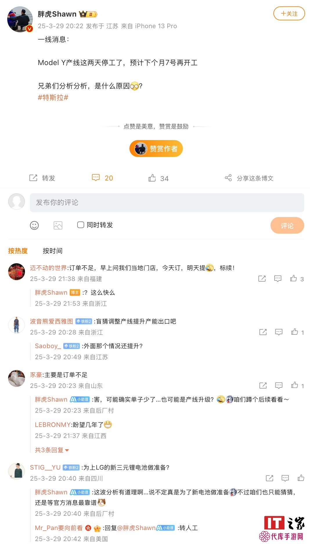 本站 3 月 29 日消息,博主“胖虎Shawn”在微博发文,声称“Model Y 产线这两天停工了,预计下个月 7 号再开工”,但没有透露具体原因。相应博主评论区有不少用户猜测认为原因是“订单不足”或“为新的三元锂电池做准备”,而博主本人并未对此进一步讨论。