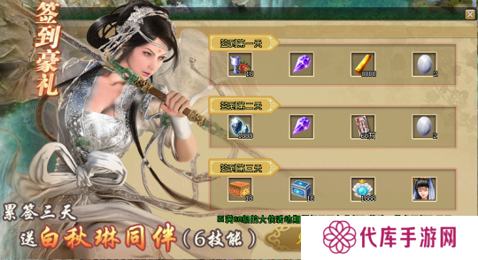 新服开启,签到打卡不仅可以领取大量的物资奖励,还可额外获得稀有的强力同伴:白秋琳(6技能),伴随大侠开启新的江湖人生!