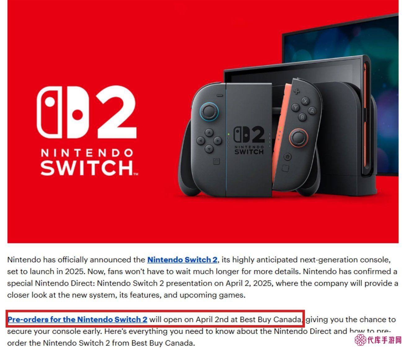 本站 3 月 28 日消息,科技媒体 The Verge 昨日(3 月 27 日)发布博文,加拿大百思买官方发布博文(目前已删除),透露将于 4 月 2 日开放任天堂 Switch 2 游戏掌机的预购。
