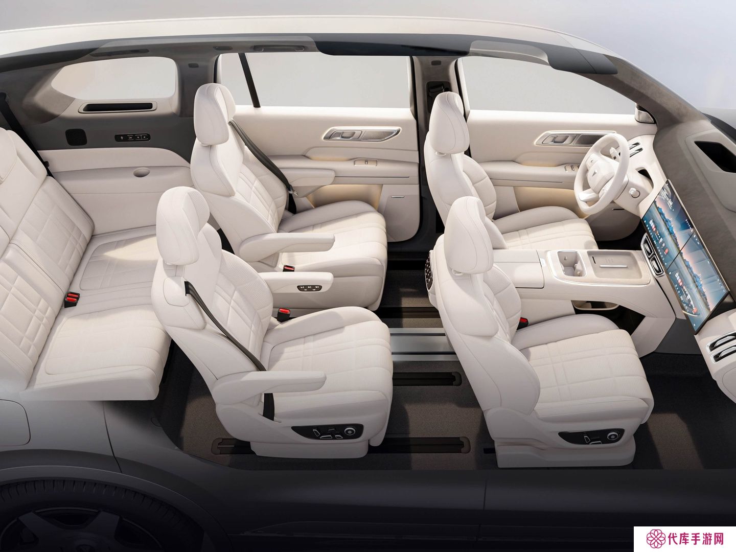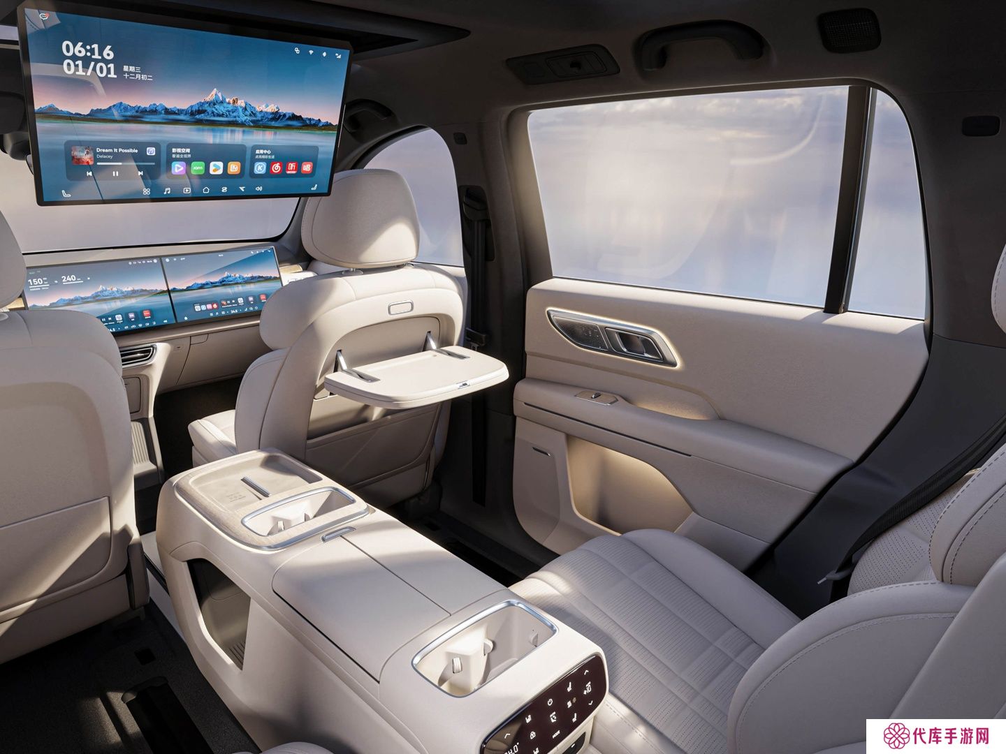 中排配备“行业唯一可横滑”双零重力按摩座椅 + 21.4 英寸高清娱乐屏。中排座椅支持 180mm 双横滑、一体式云感腿托、8 点式凸点按摩、通风、加热。此外,该车还配备 21.4 英寸、3K、16:9 比例、0-75° 电动可调后排娱乐屏。该车配备一体式智能移动中岛,翻盖式冰箱-6 至 50℃随心调。
