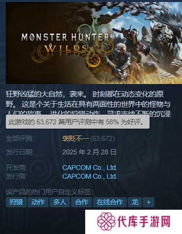 卡普空大作《怪物猎人:荒野》已上线数日,突出的数据表现延续了这个IP的成功惯例。只不过在口碑方面,《怪物猎人:荒野》还有“亿点点”问题。截止到目前,Steam好评率仅为58%。