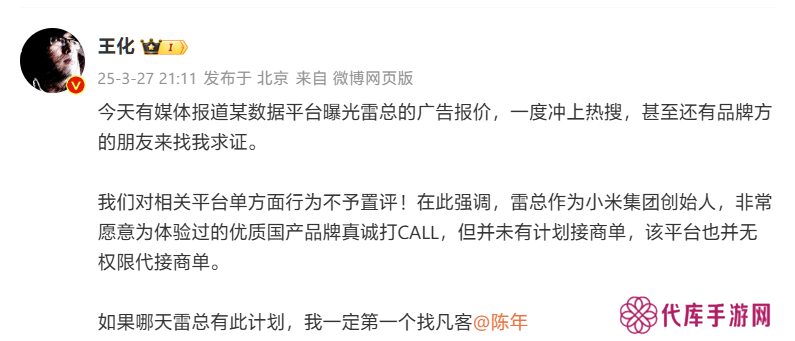 本站 3 月 27 日消息,小米集团公关部总经理 @王化 今晚在微博发文,对某数据平台曝光雷总的广告报价作出回应,该话题一度冲上热搜。王化称,甚至还有品牌方的朋友来找自己求证。
