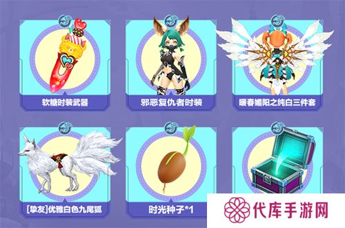 新服登录即送的好礼中还有两份特别的时光礼物。其中使用“时光种子”,轻松种植,终极大奖可在以下三项道具奖励中任选其一:[活动]黯淡黑色挚友星*2000、冰封之古代根源*1、10强梦之尽头主/副武器选择袋子*1。“时光宝盒”可以通过完成任务获得史诗级+10变换一套(14件),包含防具、武器、饰品、三件套。