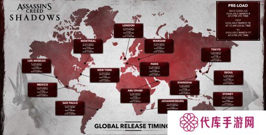 育碧官推发布了《刺客信条:影》全球各地解锁时间和主机、PC版的预载时间。