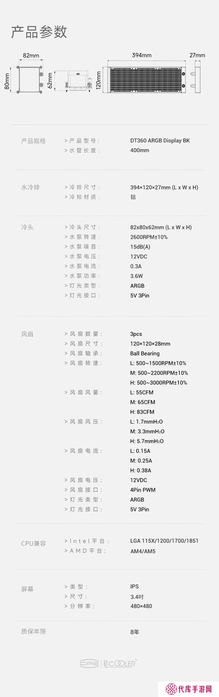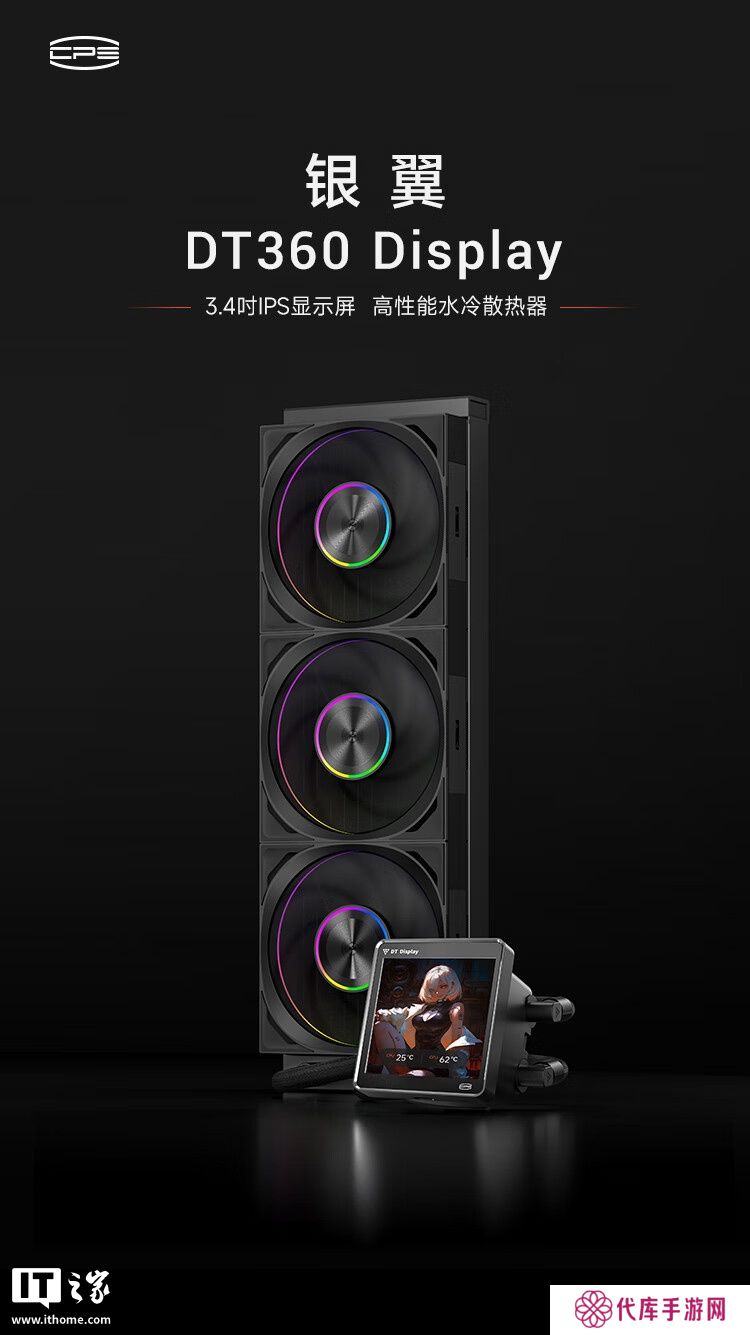 银翼 DT360 ARGB Display 的方形冷头屏幕尺寸为 3.4 英寸,分辨率为 480×480,支持 60Hz 刷新率,可显示 24 位真彩,能通过控制软件自定义显示内容。