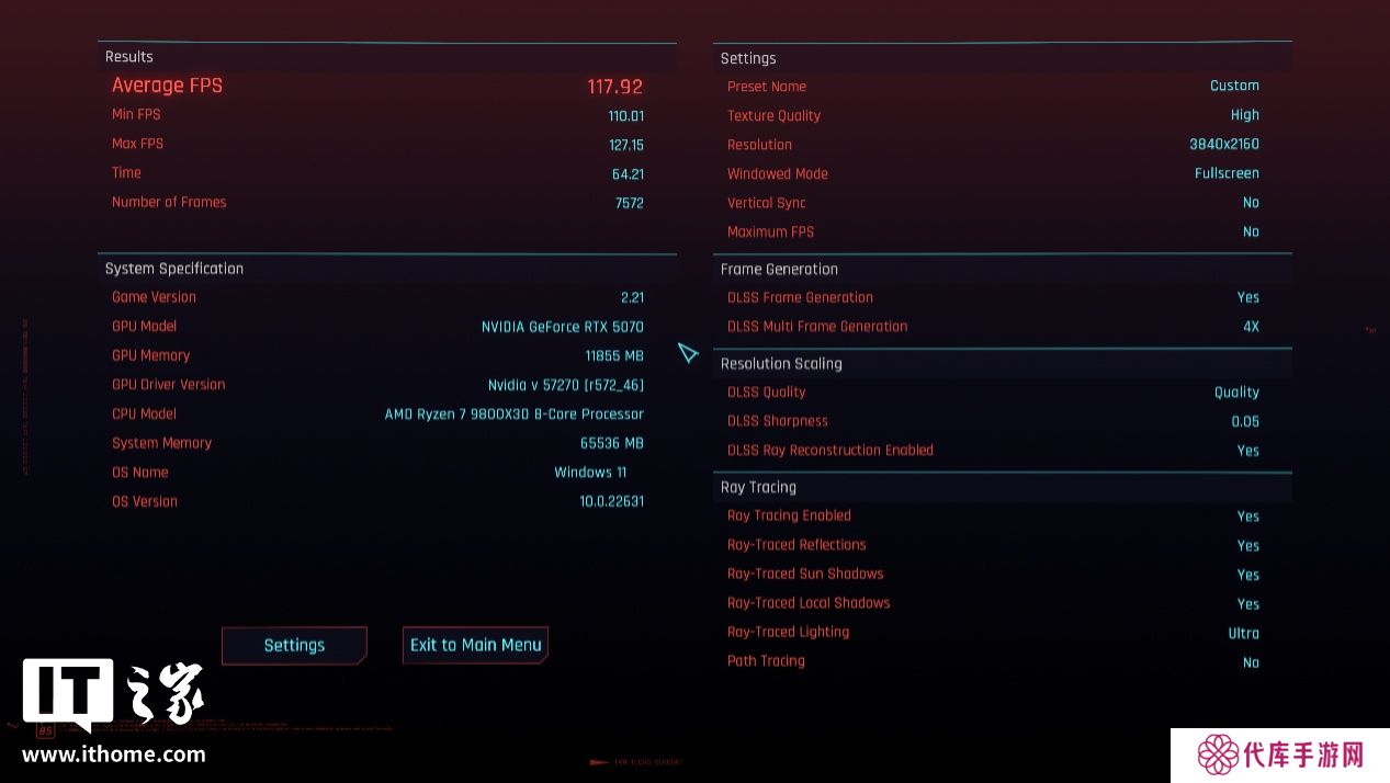 在以上 3 项测试中,索泰 GEFORCE RTX 5070 12GB XGAMING OC 显卡的成绩相较于上一代 GeForce RTX 4070 显卡均高出 25% 以上,那么配合 DLSS 技术后的游戏表现又如何呢?接下来就用实测来验证一下吧。