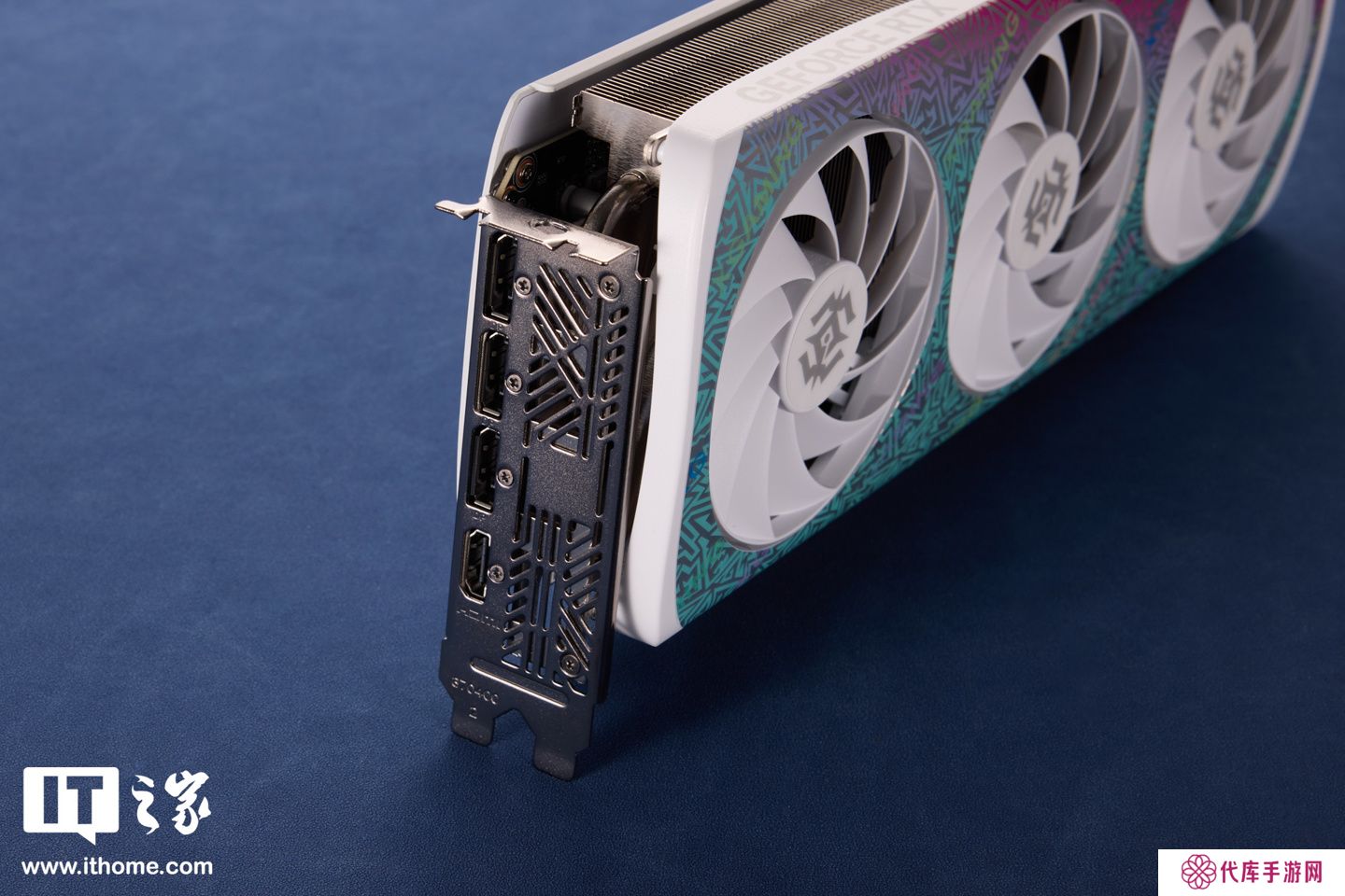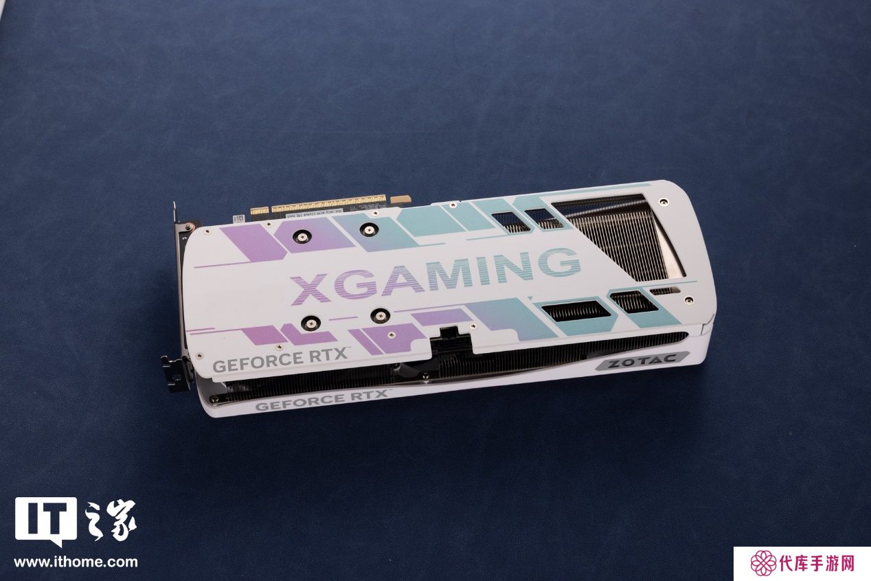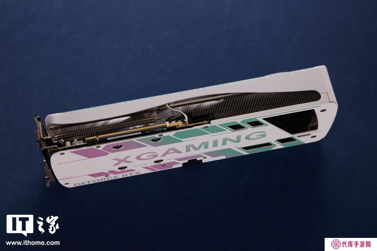 显卡背板同样采用高强度合金材料进行加固,纯白衬底配合红绿渐变的装饰纹理和 XGAMING 的英文标识依旧辨识度拉满。右侧有一组不规则的进风开口,便于提升进风量。