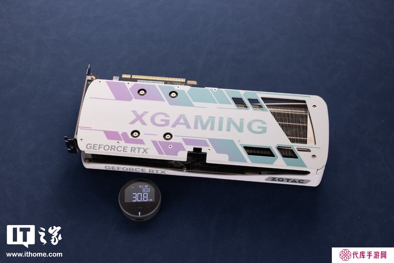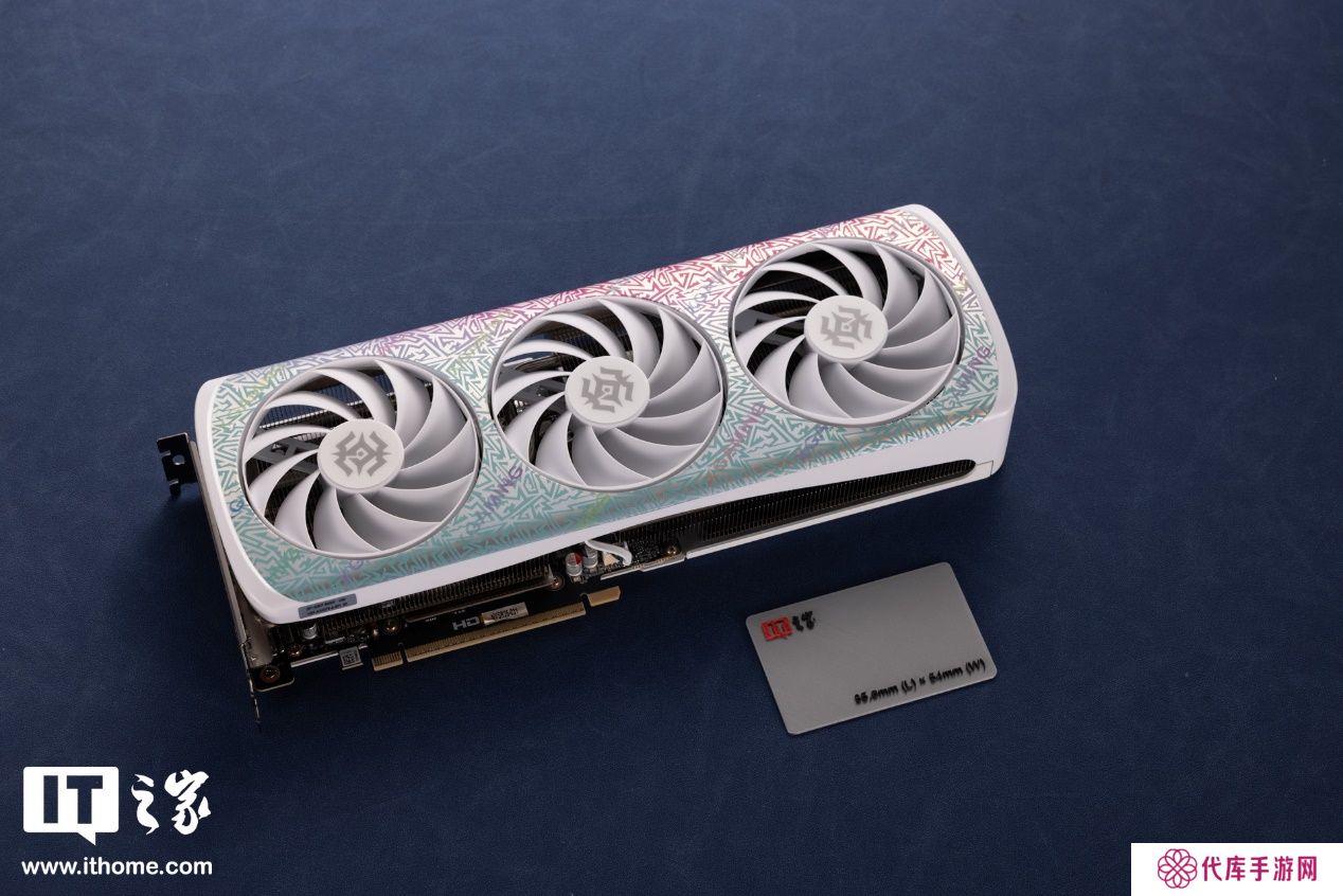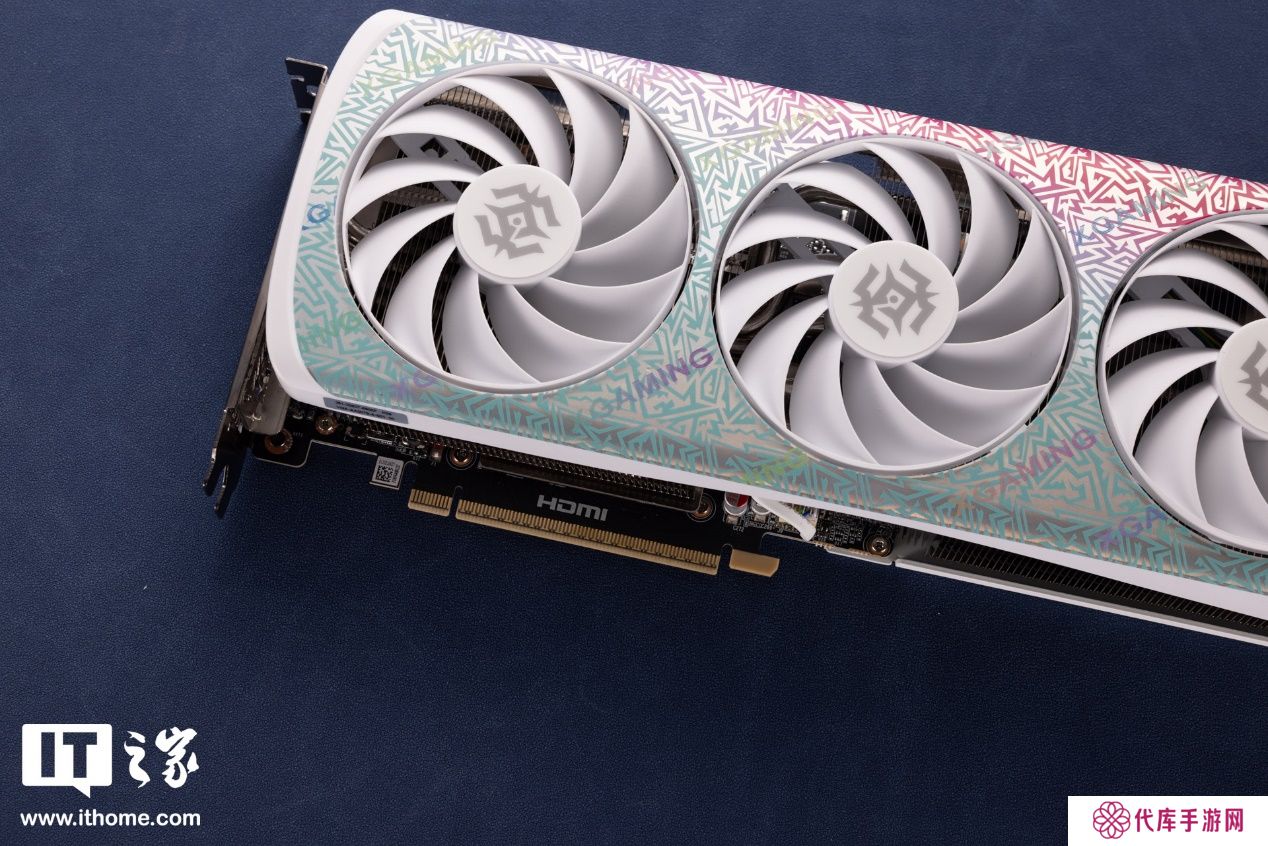 显卡背板同样采用高强度合金材料进行加固,纯白衬底配合红绿渐变的装饰纹理和 XGAMING 的英文标识依旧辨识度拉满。右侧有一组不规则的进风开口,便于提升进风量。