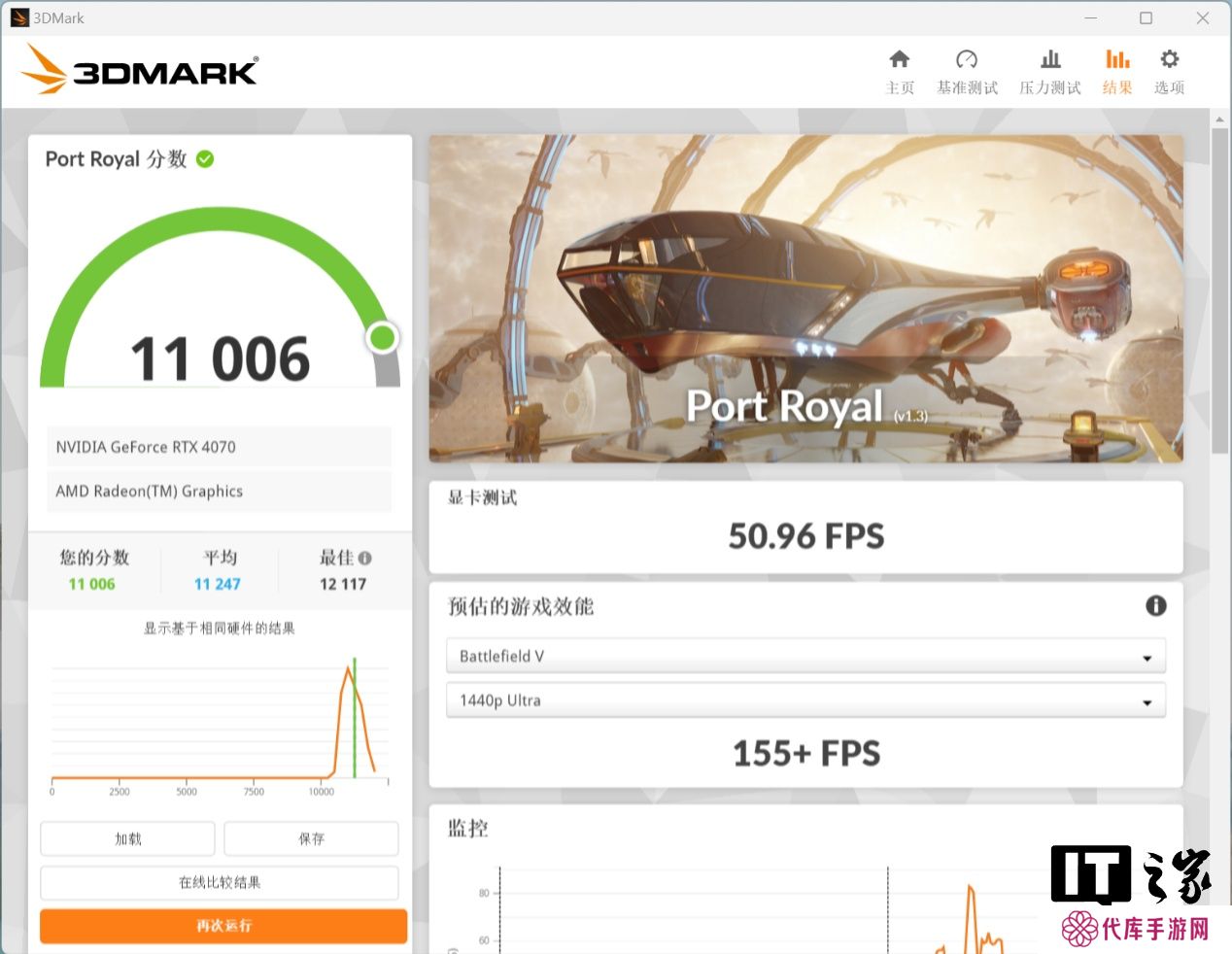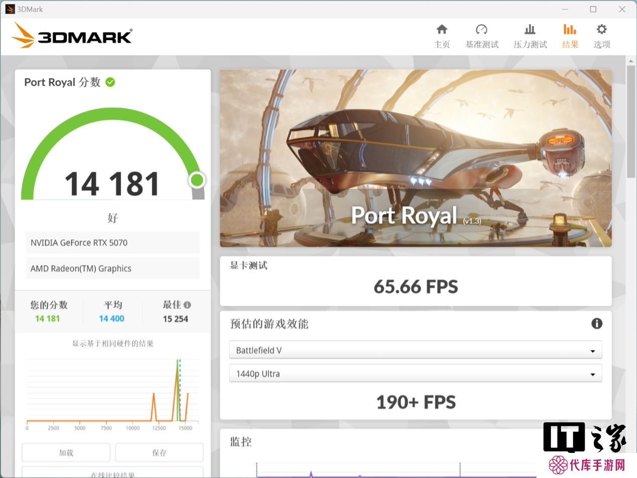 在 3DMark Portal Royal 实时光追测试中,索泰 GEFORCE RTX 5070 12GB XGAMING OC 显卡的综合分为 14181 分,对比 RTX 4070 的 11006 分,提升幅度达到了 28.8%。