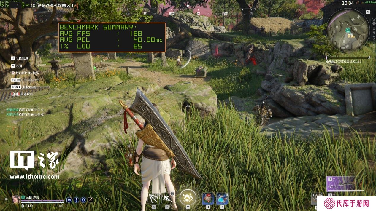 随后,当我们在设置菜单中开启 2x、3x 和 4x 多帧生成选项后,RTX 5070 的游戏平均帧数分别提升到 121 帧、169 帧、188 帧;而游戏平均延迟方面分别为 32ms、35ms 和 40ms。大家不难发现,开启多帧生成后游戏的平均延迟竟然还降低了,只有 4x 多帧生成下,平均延迟才回升到和不开多帧生成时差不多的 40ms,毫无疑问 DLSS 4 技术配合 Reflex 低延迟技术,在竞技游戏中的延迟表现完全可以接受。