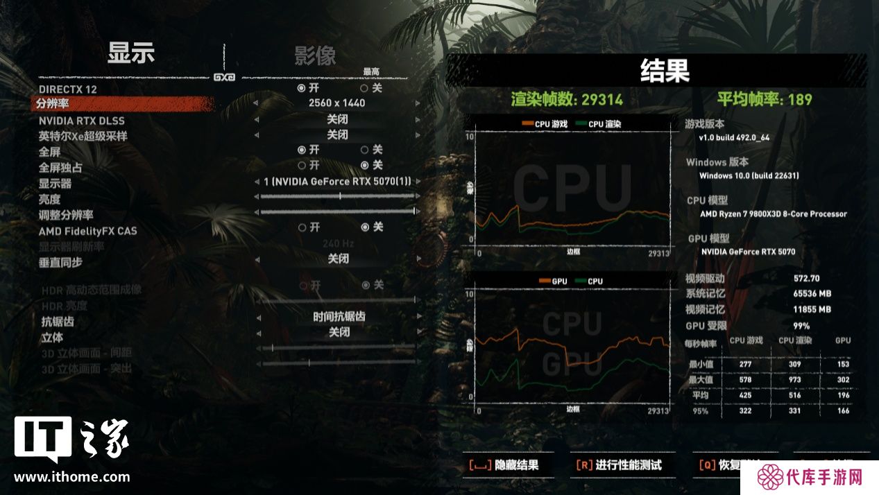 RTX 5070 在 2K 分辨率 + 最高画质下,游戏平均帧数为 189 帧,1% Low 帧 140 帧;
