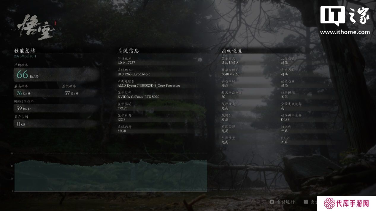 RTX 5070 在 4K 分辨率 + 超高画质 + 50% 超采样分辨率 + 高全景光追 + 帧生成下,游戏平均帧数为 66 帧,1% Low 帧 55 帧;