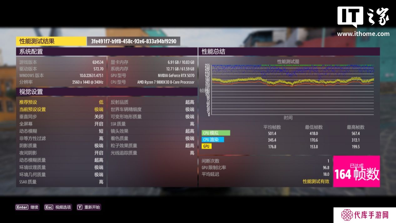 RTX 5070 在 2K 分辨率 + 极端画质下,游戏平均帧数为 164 帧,1% Low 帧 136 帧;