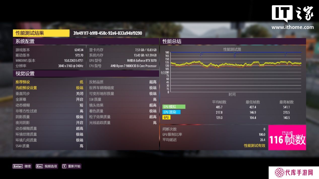 RTX 5070 在 4K 分辨率 + 极端画质下,游戏平均帧数为 116 帧,1% Low 帧 100 帧;