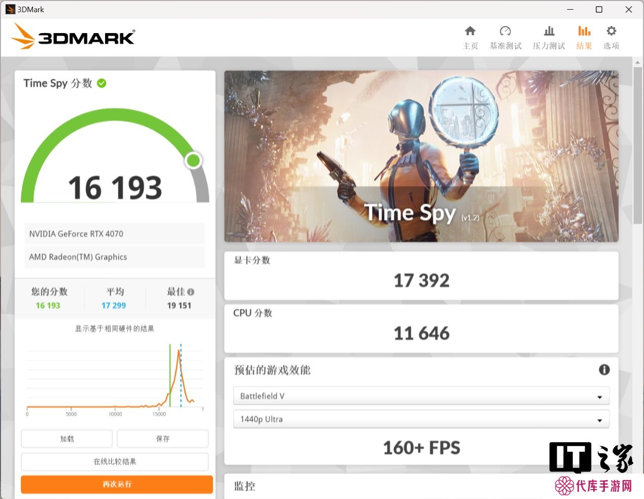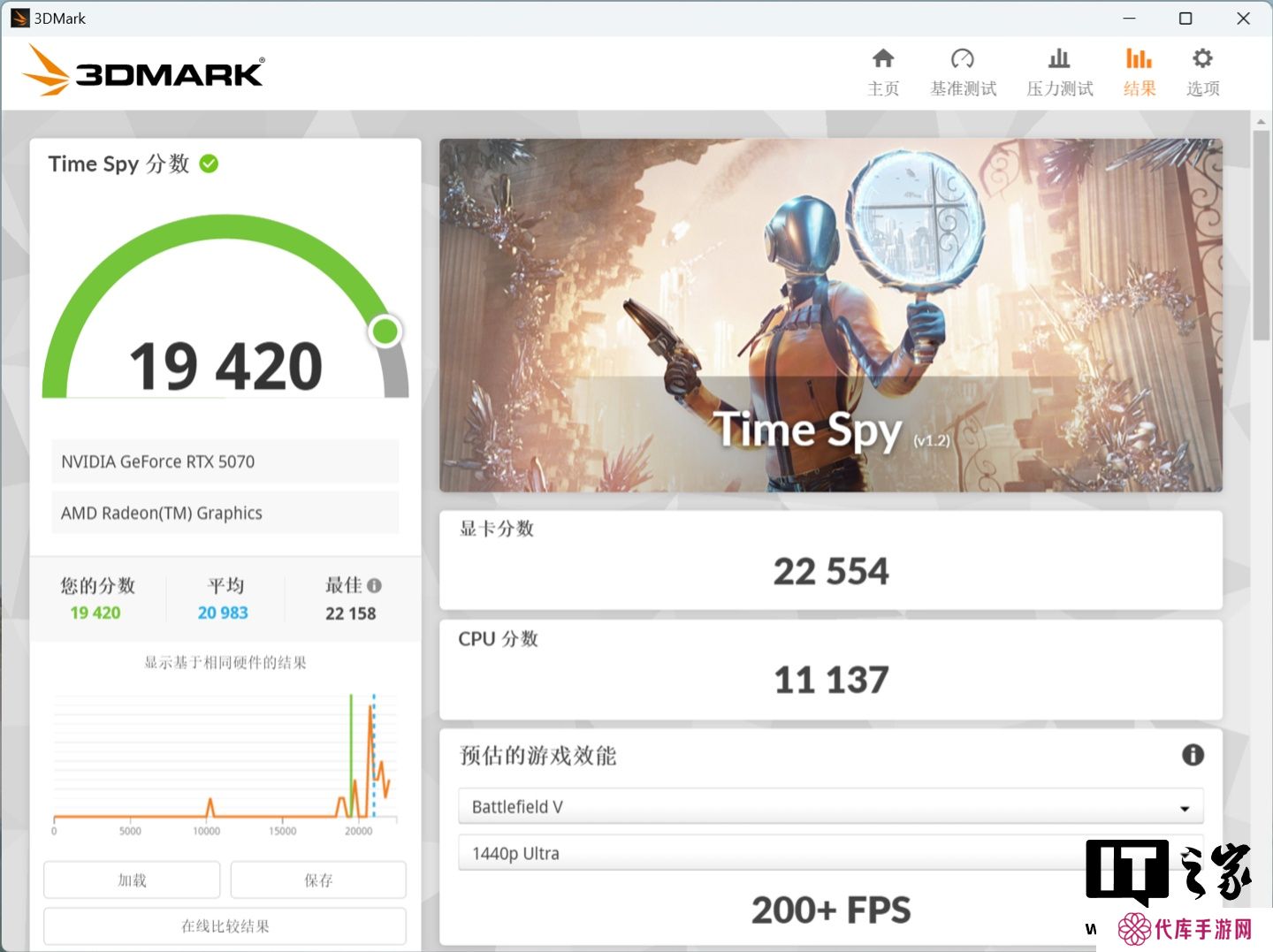 在 3DMark Time Spy DX12 测试中,索泰 GEFORCE RTX 5070 12GB XGAMING OC 显卡得分达到了 22554 分,对比 RTX 4070 的 17392 分,提升幅度约 29.6%。