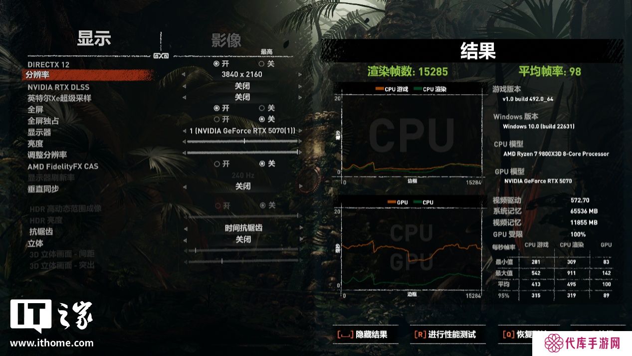 RTX 5070 在 4K 分辨率 + 最高画质下,游戏平均帧数为 98 帧,1% Low 帧 84 帧;