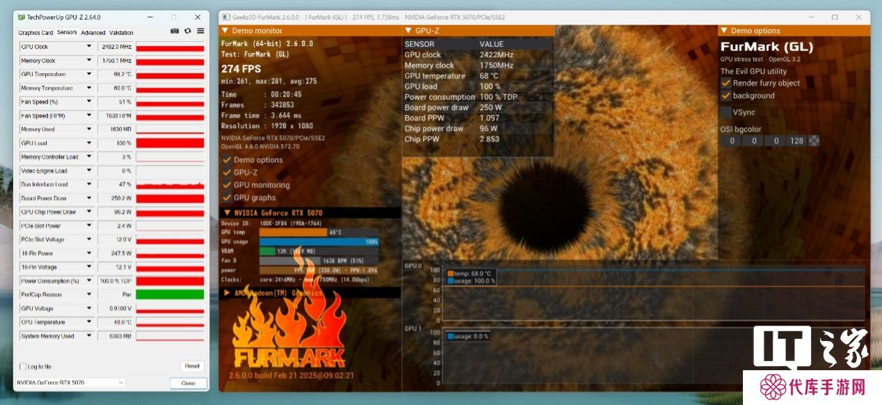 先看烤机,索泰 GEFORCE RTX 5070 12GB XGAMING OC 显卡在甜甜圈单烤 20 分钟后,GPU 功耗稳定在了 250W,GPU 主频为 2482MHz,而 GPU 温度为 68.2℃。