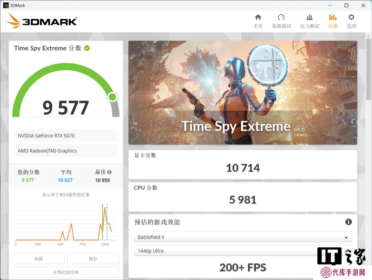 在 3D Mark Time Spy Extreme DX12 测试中,索泰 GEFORCE RTX 5070 12GB XGAMING OC 显卡得分达到了 10714 分,对比 RTX 4070 的 8261 分,提升幅度约 29.6%。