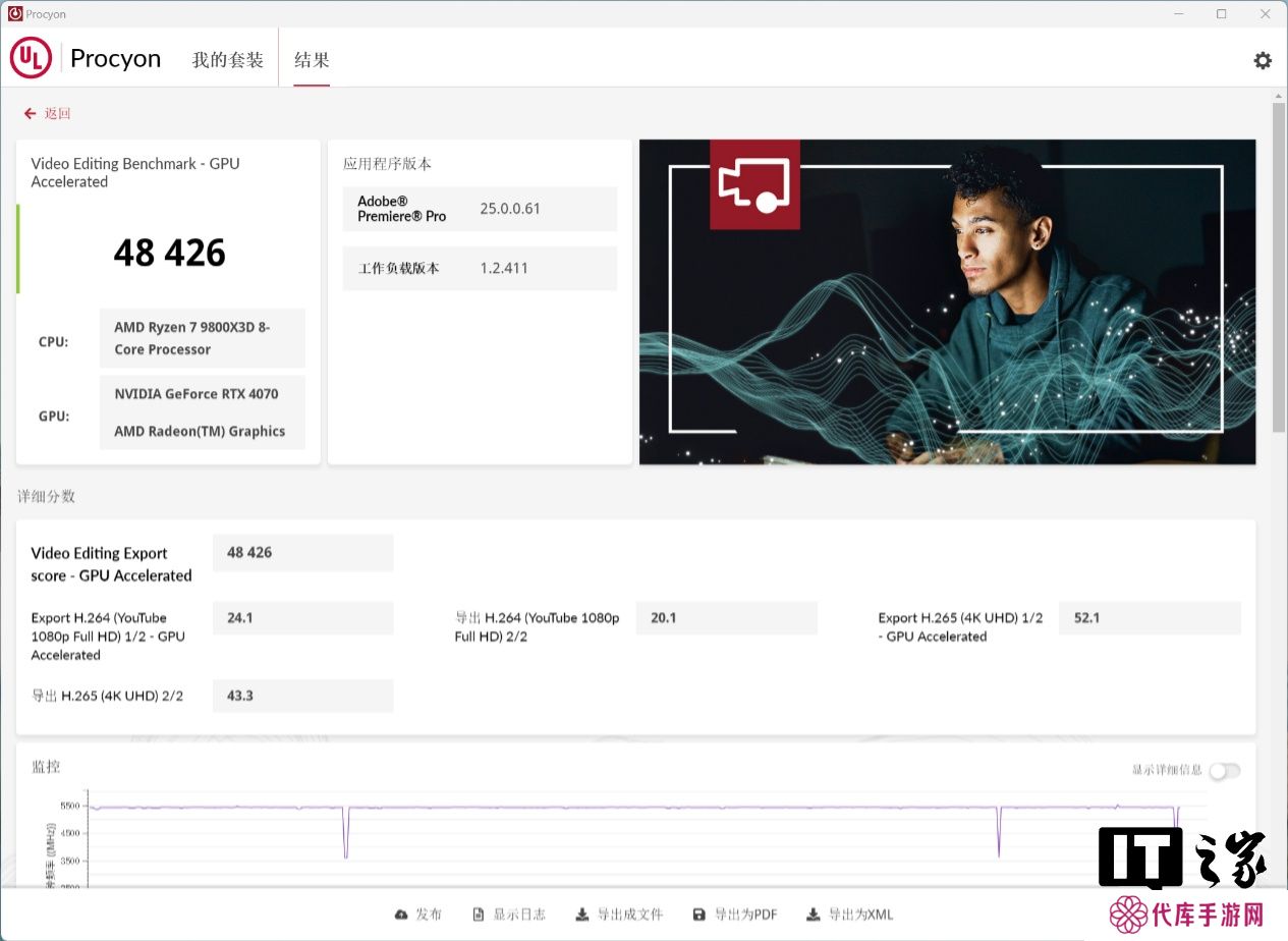 在 UL Procyon 的视频剪辑性能测试项目中,GPU 加速,得益于 Blackwell 架构升级的第九代 NVENC 编码器和 NVDEC 解码器,其在 H.264/ H.265 4:2:2 编码的 8 位和 10 位视频上有着非常大的优势,经过实测: