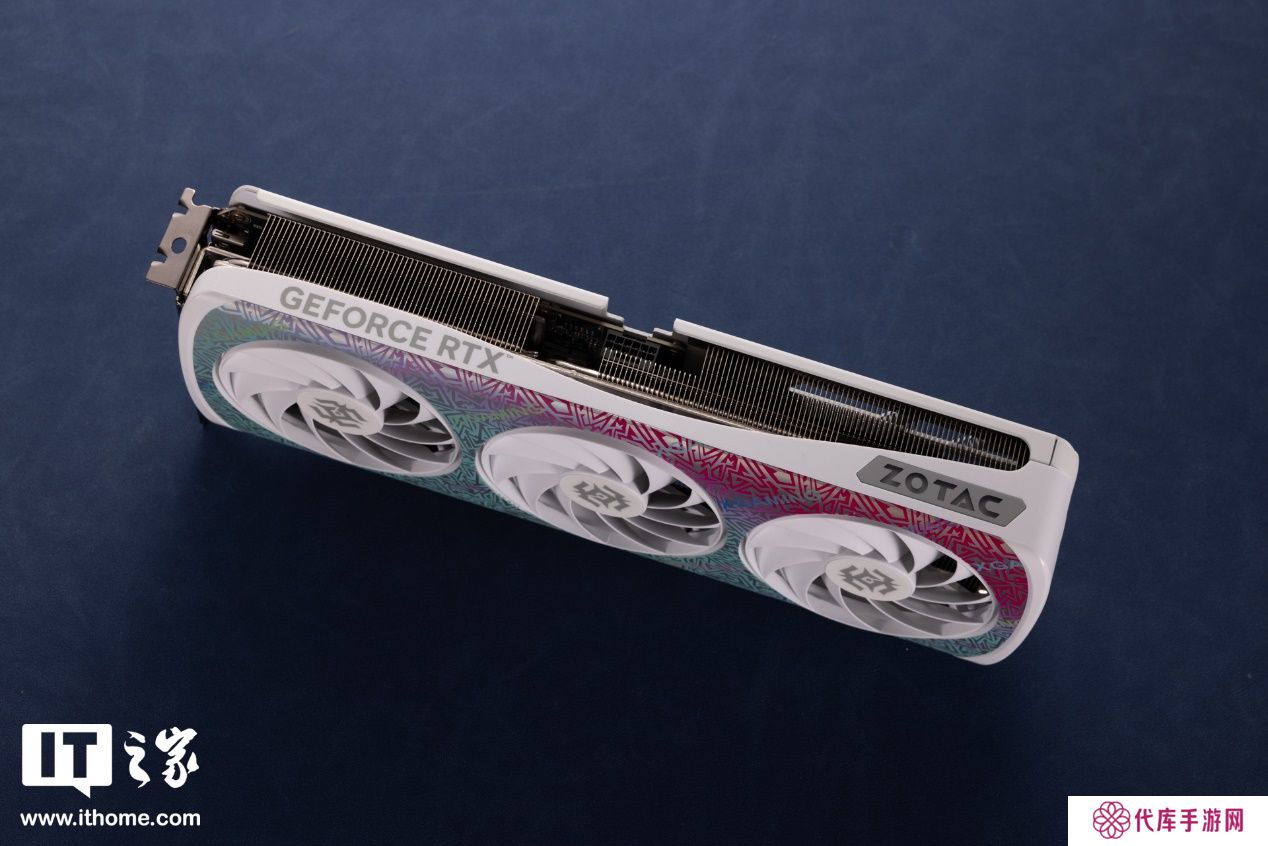 从侧面看,显卡正面装甲会延续一部分包裹住侧面,一侧印有 GEFORCE RTX 的标志和会发光的 ZOTAC Logo,开机后默认是白光。