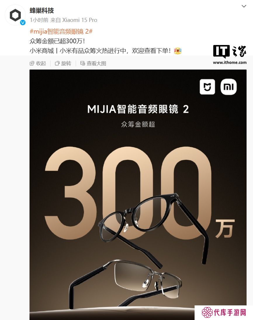 本站 3 月 26 日消息,北京蜂巢世纪科技有限公司官方微博今日发文称,MIJIA 智能音频眼镜 2 众筹金额已超 300 万。