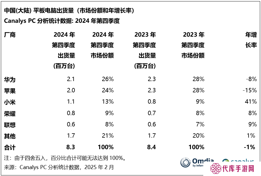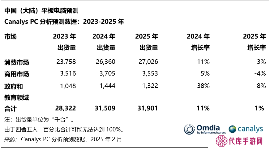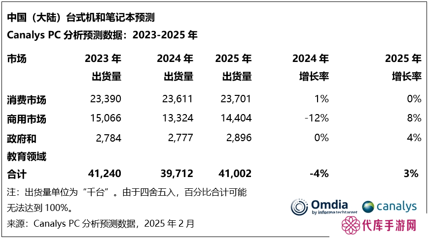 Canalys 预测,得益于**消费补贴和主要厂商新品发布,2025 年中国大陆的 PC 市场将增长 3%,达到 4100 万台,平板电脑市场将增长 1%,达到 3190 万台。