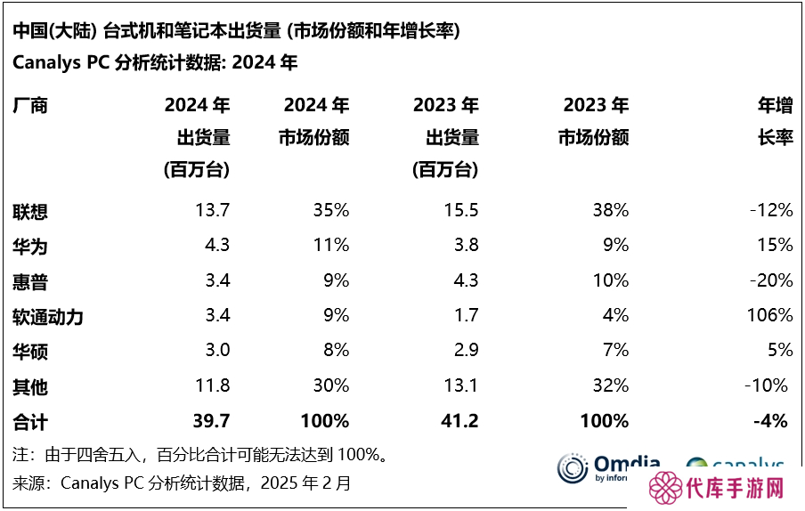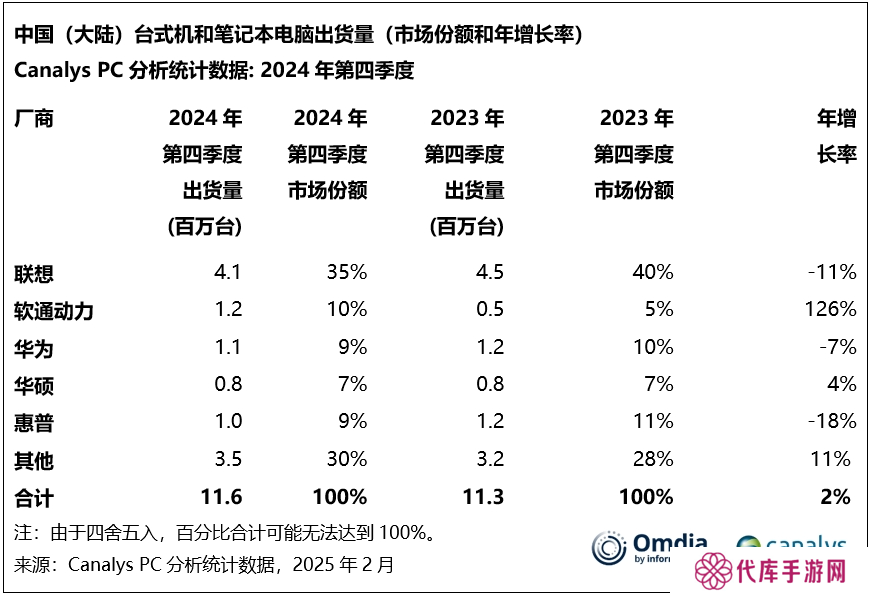 本站 3 月 12 日消息,Canalys 今日最新数据显示,受到消费需求激增 8% 的推动,2024 年第四季度中国大陆的 PC 市场开始复苏,同比增长 2%。