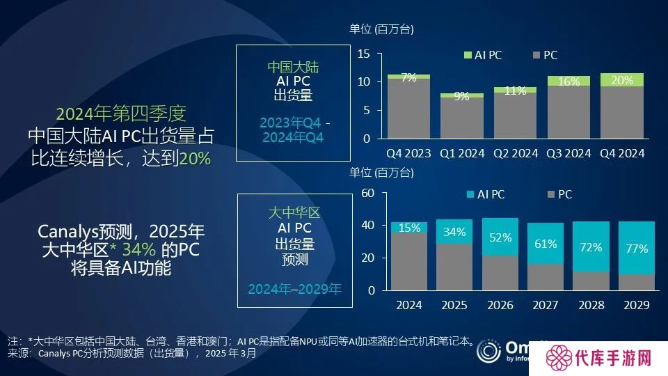 Canalys 数据显示,AI PC 出货量在 2024 年稳步增长,达到 580 万台,占去年中国大陆 PC 总出货量的 15%。这一趋势预计将加速,到 2025 年,预计大中华区 PC 出货量中,AI PC 将占 34%。