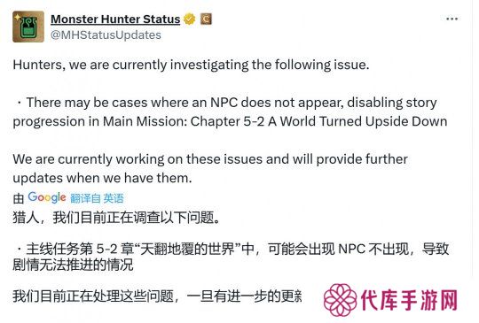“猎人们,我们目前正在调查以下问题。可能存在NPC不出现的情况,导致主线任务:第5-2章《颠倒的世界》的故事进程受阻。我们目前正在努力解决这些问题,并在有进一步更新时提供。”