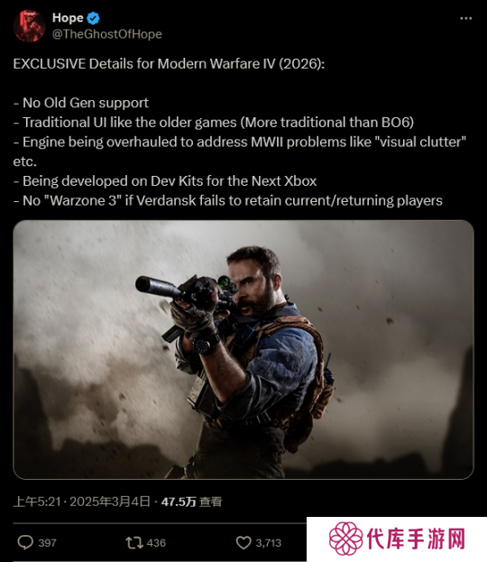 根据此前曾多次泄露正确信息的《使命召唤》泄密者 TheGhostOfHope 在社交媒体上爆料称,《使命召唤》2026 年的新作正在为下世代 Xbox 主机开发。这据称将是目前《现代战争》子系列的新作。