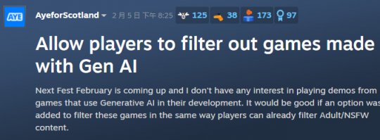 在全球最大的数字游戏分销平台Steam上,玩家们正在呼吁V社能够上线AI作品筛选功能。大家明确表示,对AI生成游戏不感兴趣,希望可以过滤到这些内容。