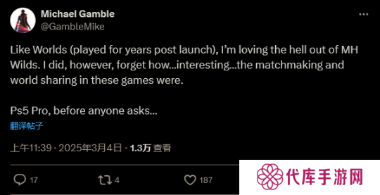 开发商 BioWare 负责人,《质量效应》总监 Michael Gamble 最近就在社交媒体上“吐槽”了这一点。他写道:“酒相《世界》(发布后玩了好几年)一样,我非常喜欢《怪猎:荒野》。然而,我确实忘记了这些游戏中的匹配和世界共享机制多么‘有意思’。”