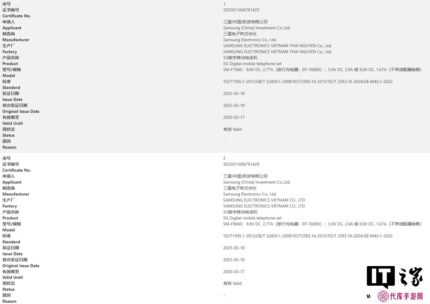 目前,三星 Galaxy Z Fold7 大折叠手机和 Galaxy Flip7小折叠手机均已通过国家3C质量认证,型号分别为SM-F9660 / SM-F7660,两款手机均支持25W充电,不过相应机型的其他确凿规格尚未得到确认。