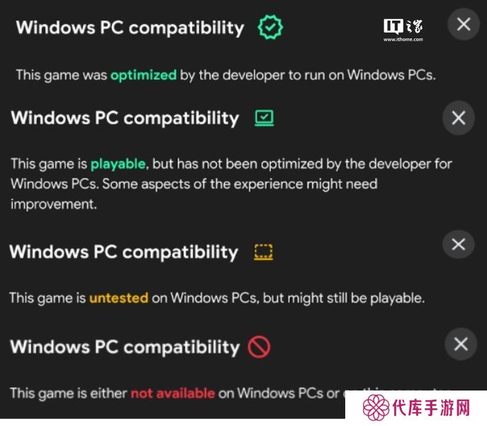 可玩性徽章拥有 4 个等级,由已优化到不可玩从高到低排列。根据谷歌官方透露,从本月开始,《原神》、《王权之忆》、《渔帆暗涌》、《全面战争模拟器》等热门游戏将适配 Google Play Games PC 版,以吸引更多用户。