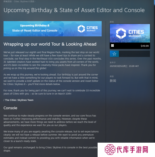 P 社表示,开发商 Colossal Order 的团队正在主机版开发上取得“稳定进展”,并补充称主机版开发的核心重点是性能和稳定性改进。然而“为了让游戏达到我们希望玩家获得的质量和水平”,还有很多事情要做。