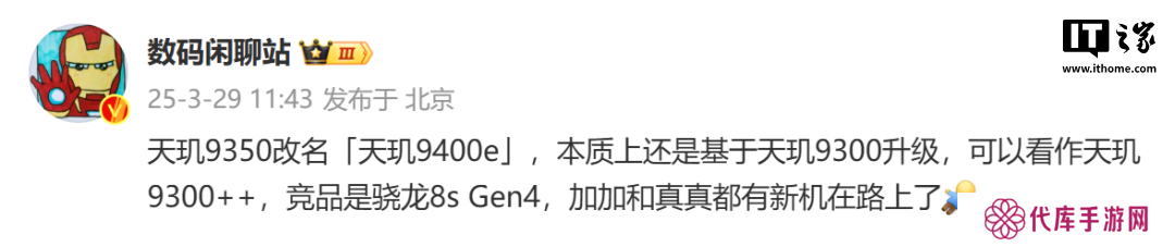 也许是受到 iPhone 16e 命名的启发,也可能是汲取了 PC 行业英特尔和 AMD 的命名方式,博主 @数码闲聊站 的最新爆料显示原本的“天玑 9350”已经改名为“天玑 9400e”了。