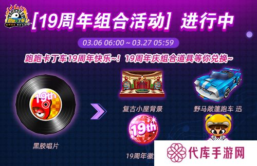 使用“黑胶唱片”,参与3月6日 06:00至3月27日05:59期间开启的<19周年组合活动>,将可兑换包括“野马敞篷跑车 迅(无限制)”、“复古小屋背景(无限制)”、“复古头饰(无限制)”、“19周年车牌(无限制)”、“19周年徽章(无限制)”等在内的19周年活动道具!