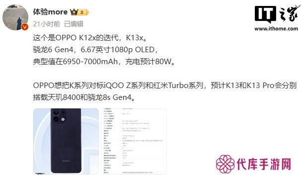 此外,该博主还爆料称,OPPO 想把 K 系列对标 iQOO Z 系列和红米 Turbo 系列,预计 K13 和 K13 Pro 会分别搭载天玑 8400 和骁龙 8s Gen4。