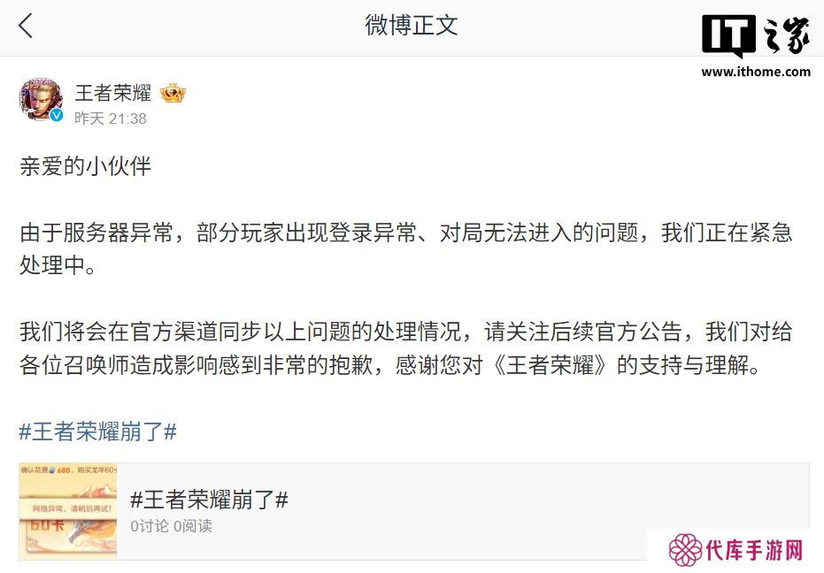 本站 3 月 29 日消息,昨晚有多位本站小伙伴投稿反馈称,《王者荣耀》突发故障,表现多为匹配后的倒计时阶段无法进入对局、无法登录游戏等。