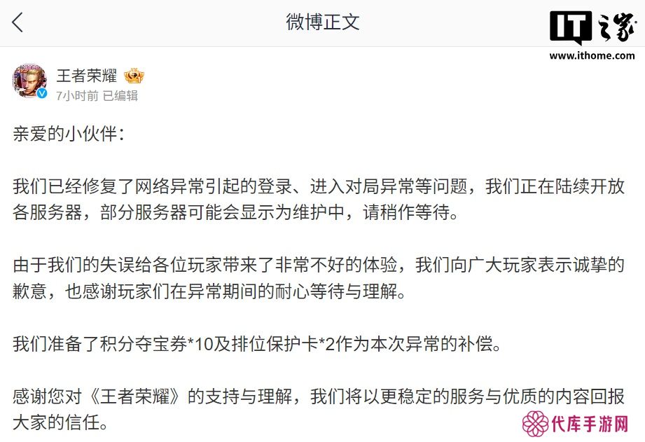 感谢您对《王者荣耀》的支持与理解,我们将以更稳定的服务与优质的内容回报大家的信任。