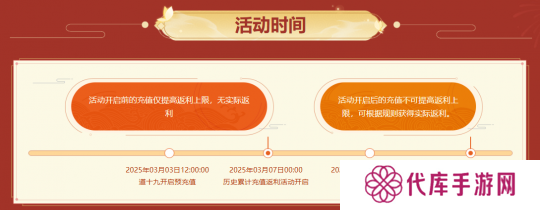2025年3月7日00:00至4月13日23:59,返还上限不为0的道友在开服后每充值100元可获得价值预期为50元的额外银元宝或赠品道具(即返还比例预期为50%,玩家获得的返利不得大于返利上限。)
