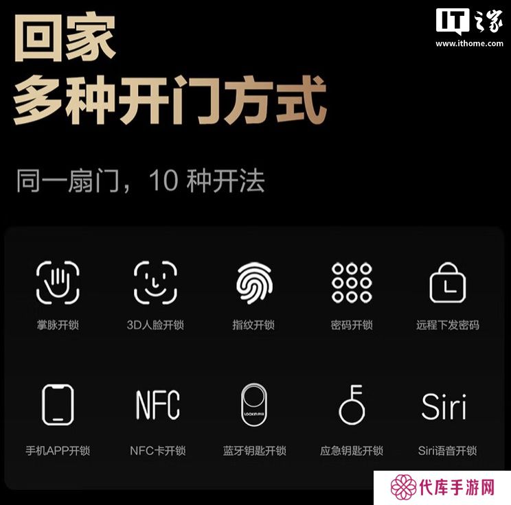 该门锁应用了多眸掌静脉识别技术,同时配备结构光3D解锁,其他方面还支持指纹开锁、密码开锁、手机App开锁、NFC卡开锁、蓝牙钥匙开锁、Siri语音开锁、应急钥匙开锁。