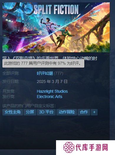 由Hazelight Studios开发的双人合作冒险游戏《双影奇境》,今日已正式发布上线全平台。本作一经上线,已收获了不俗的热度和玩家关注。Steam国区售价198元,当前在线玩家人数为5万+,Steam好评率来到了97%特别好评,并迅速登顶了Steam热销榜。