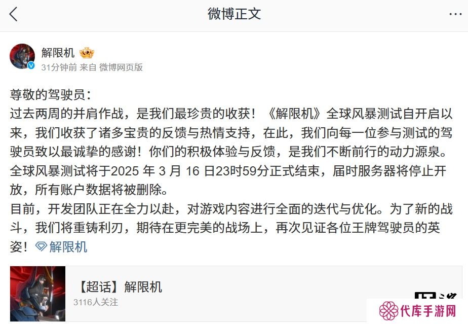 本站 3 月 12 日消息,西山居旗下科幻机甲游戏《解限机》官方今日宣布:全球风暴测试将于 2025 年 3 月 16 日 23 时 59 分正式结束,届时服务器将停止开放,所有账户数据将被删除。